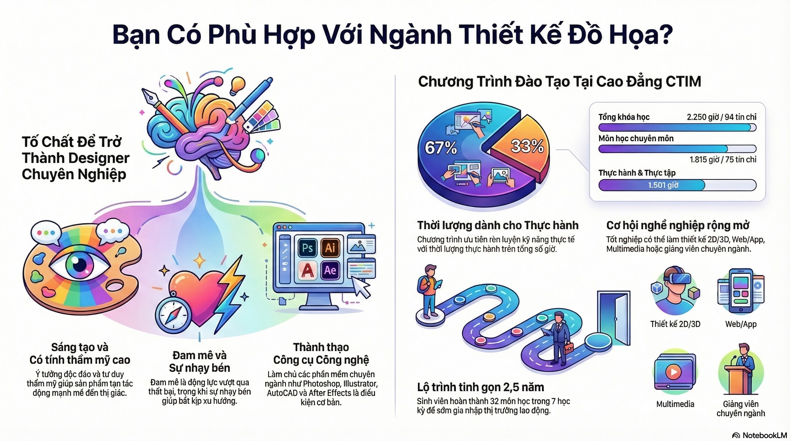 Đặc thù của ngành thiết kế đồ họa là cần phải có sự sáng tạo. Các sản phẩm luôn đòi hỏi phải có sự thẩm mỹ, có sự tác động mạnh mẽ đến người nhìn. Nên nếu không có óc sáng tạo, những sản phẩm không có sự đột phá, rất dễ gây nhàm chán đối với công chúng. Vì thế, những bạn có khả năng thẩm mỹ cao, có sự tinh tế, sự độc đáo rất nên kết thân với ngành học này.
